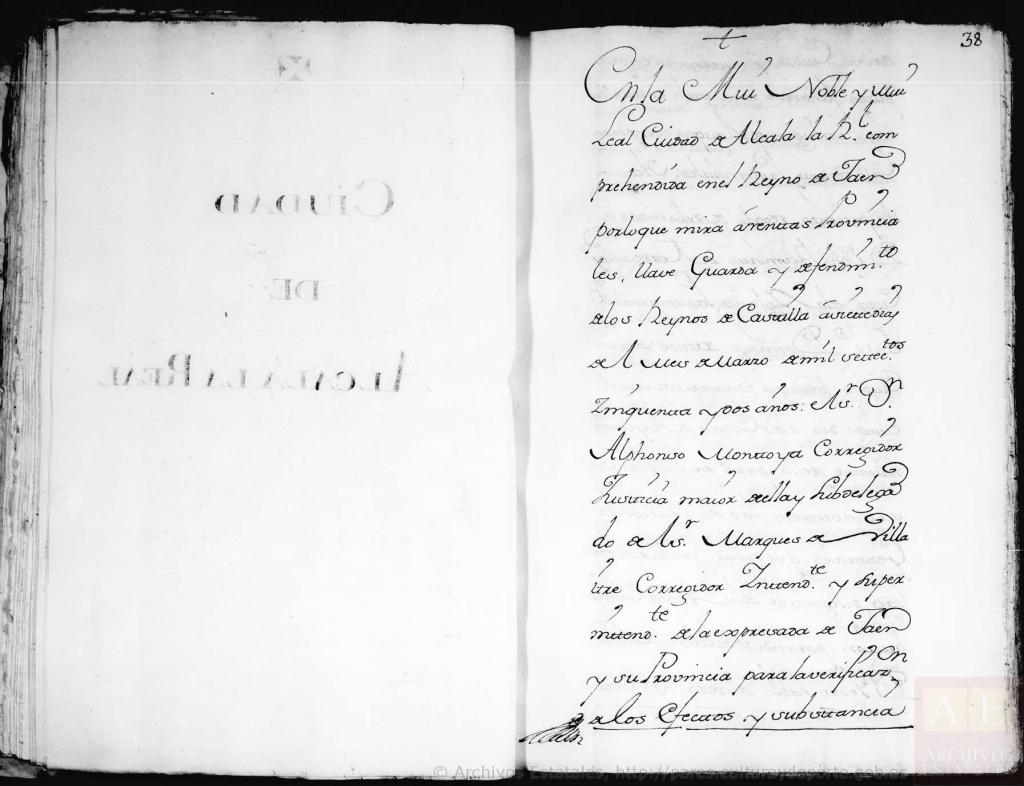 En la muy noble y muy leal Ciudad de Alcalá la Real (comprendida en el Reino de Jaén, por lo que mira a rentas Provinciales, llave, guarda y defendimiento de los Reinos de Castilla, a siete días del mes de Marzo de mil setecientos cincuenta y dos años; El Señor Don Alfonso Montoya, Corregidor Justicia mayor de ella, y Subdelegado del señor Marques de Villaitze, Corregidor, Intendente y superintendente de la expresada de Jaen y su provincia; para la verificación de los efectos y sustancia de esta Ciudad y su término, en que pueda fundarse una sóla Contribución, en lugar de las que componen las Rentas Provinciales; Habiendo precedido recado de urbanidad a Don Joseph Ramirez de Tordesillas, Cura de la Iglesia Parroquial del Señor Santo Domingo de Silos de esta Ciudad para que concurriese en el citado día, a las casas de Ayuntamiento de ella, para principiar con su asistencia las Declaraciones Generales, que deban recibirse en las diligencias de la Única Contribución, por indisposición de los señores Don Pedro Pablo de Vera y Barnuevo, Gobernador, Provisor, y Vicario General de esta Abadía y de Don Juan Manuel Zedillo, Vicario de las Iglesias de esta dicha Ciudad; y prevenido igualmente a Don Manuel de Lastres, Clavijo y Valenzuela, Caballero de la Orden de Calatrava, Alferez mayor de esta dicha Ciudad, y Don Miguel Francisco Espinosa de los Monteros, Abogado de los Reales Consejos, ambos Regidores perpetuos de ella, y a Don Joseph Ruiz Castellanos, Jurado de decano de su numero y Síndico Procurador General de esta expresada Ciudad; Lo ejecutasen con los sujetos y vecinos considerados por el Muy Noble y Leal Ayuntamiento de esta dicha Ciudad por de la mayor opinión, inteligencia y conocimiento, tanto en las calidades, y cabidas de las tierras que hubiere en la situación del término de ella, su Cultura, y frutos que producen; como en el número de personas que compone su vecindad, artes, comercios, y granjerías de cada uno de ellos, para que con los diversos sus señorías protestaba nombrar, y traer de los pueblos más inmediatos, declarasen todos juntos sobre cuanto fuesen preguntados; de lo cual yo el infraescrito de este cometido, doy fe; estando presentes los dichos Don Manuel de Lastres, Don Miguel Espinosa, Don Joseph Ruiz y Don Luis Yñiguez de Valdeosera escribano mayor del Cabildo, y Ayuntamiento de esta Ciudad; Antonio de Frías, Pedro Moreno, Juan Esteban Palomino, Fernando Marquez, Pedro Bailón, Antonio de Ortega, Juan Romero Abril, Juan Mudarra, Manuel Hoyo, y Juan Castillo Cortecero, aquellos vecinos de esta Ciudad, y este del Lugar del Castillo Locubín de su término y Jurisdicción, personas elegidas por la misma Ciudad: Francisco Nicasio Peñalver, y Juan Gutiérrez, agrimensores nombrados por su señoría el señor Corregidor Subdelegado, vecinos así mismo este, de esta Ciudad y aquel de dicho Lugar del Castillo, inteligentes y prácticos en el conocimiento, medidas y calidades de las tierras; su señorías a presencia del referido Don Joseph Ramírez de Tordesillas, Párroco, y de mí el escribano, recibió Juramento de todos los referidos Regidores, Procurador, Síndico, escribano mayor de Ayuntamiento, y demás personas que quedan expresados, y de cada una de ellas, con distinción, a excepción del dicho cura, el que hicieron a Dios, y a una Cruz en forma de derecho, prometiendo decir verdad, en lo que supieren, y fueren preguntados: y siéndolo por el Interrogatorio impreso que va por cabeza como se previene al Capítulo IV de la Real Instrucción, dijeron lo siguiente…