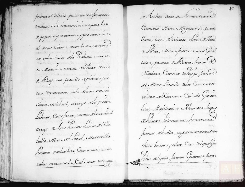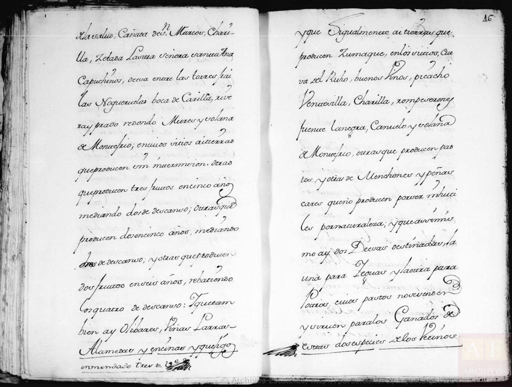 A la cuarta pregunta, dijeron, que en el término de esta ciudad, se hallan diferentes especies de regadío que sirven para los frutales, siembras, hortalizas, maíses, linos, habas, cáñamo, y otras semillas, en los sitios Venta del Carrizal, presa de Siles, arroyo de las Parras, Isla, Caz, Valle de Señor Don Joseph y Colmenero, sahinar y rozuela, Fuente Matheo, Valle de Jesus y María, Puerto de Valdepeñas, Rábita, Fuente de el Soto, y Hortichuela, Molino de las Juntas, Ribera, Frailes, Charilla, Fuente Nueva y Azacayas, Cauchil, Fuente del Rey, Fuente Somera, Robledo, Vereda del Carmen, y Zurreadero; Y que en las expresadas tierras las de Primera Calidad, producen tres frutos en dos años sin intermisión, y uno las de segunda, y tercera; Y que así mismo hay otras tierras de sembradura de secano, en los sitios de la Rábita, Barranco Moriano, Sierra de San Pedro, Cerro de Vaqueros, Portillo de Piedras pardas, Retamoso, Vado de la Venta, Chiclana, Salobral, Arroyo de la Piedra, Lanear, Coscojares, Venta del Carrizal, Arroyo de las Parras, Loma del Caballo, Nava del Peral, Morenilla, Puerto, Azibuchar, Camorra, Romerales, Sierrezuela, Cabreras, Barranco de la hoz, Dehesa de fuente tetar, Camuña, Nava, Noguerones, Puerto llano, Torre del dañador, Loma de Jurada, Villar, Mata, Fuente nueva, Guadalcotón, Pasada de Baena, Heras de Narvaez, Camino de Priego, Fuente de el Ayozo, Portillo de las Carretas, Vereda del Carmen, Cañuelo, Gallombar, Majalcorón, Alamoso, Eras de Velasco, Palancares, Hondonera, Fuente de la Olla, Agramaderos, Menchón bajo y alto, Cruz del quejigar, Peña del Yeso, Fuente Granada, Fuente de la salud, Cañada de San Marcos, Charilla, Zelada, Lastra, Señora Santa Ana, Capuchinos, Dehesa entre las Torres, Frailes, Nogueruelas, Boca de Charilla, Ribera y Prado redondo, Mures, y Solana de Montefrío, en cuyos sitios hay tierras, que producen sin intermisión. Otras que producen, tres frutos en cinco años, mediando dos de descanso; Otras que producen dos en cinco años, mediando tres de descanso; Y otras que producen dos frutos en seis años rebatiendo los cuatro de descanso; Y que también hay olivares, viñas, parras, alamedas, y encinas y quejigos; Y que igualmente hay tierras que producen zumaque, en los sitios: Cueva del Búho, Buenos vinos, Picacho, Ventosilla, Charilla, Rompeserones, Fuente la negra, Cañuelo, y solana de Montefrío; Otras que producen Pastos, y otras de Menchones, y Peñascares que no producen por ser inútiles por naturaleza; Y que así mismo hay dos Dehesas destinadas la una para yeguas, y la otra para potros; cuyos pastos no se venden, y sirven para los ganados de estas dos especies de los vecinos de esta Ciudad, y de su Lugar del Castillo, y responden…