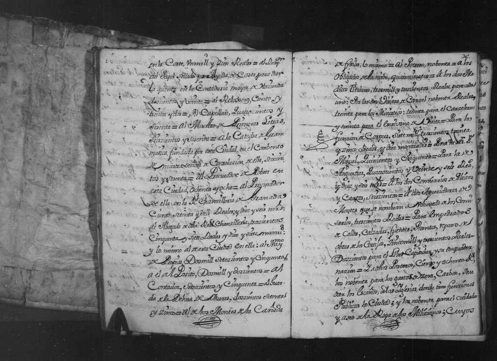 A los dos comisarios de pleitos y cartas, seiscientos; a dos apreciadores de montes que se nombran a voluntad de los comisarios, trescientos reales; para empedrados de calles, calzadas, fuentes, puentes, reparos de obras de los cortijos, cinco mil y trescientos reales; doscientos para el Libro Capitular y su encuadernación; y a dichos porteros, ciento y ochenta reales, los noventa para los gastos de cera, carbón, mudar los escaños a las iglesias donde tienen funciones públicas la ciudad, y los noventa para el cuidado y aseo de la ropa de los milicianos, cuyos gastos que se distribuyen en pagar los salarios de justicia y regidores, y demás que contiene esta pregunta, parece asciende por mayor a seis fanegas de trigo, trece de cebada, y cuarenta y ocho mil cuatrocientos y cinco reales, y responden…